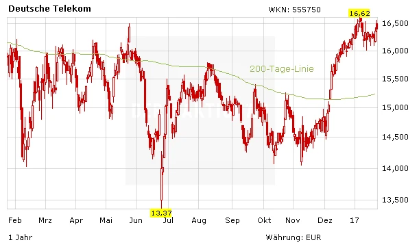 Aber auch ohne Spekulation gewann die T-Aktie zum Jahresende 2016 um 15 Prozent dazu. Im neuen Jahr wird das hohe Kursniveau von gleich zwei technischen Marken gestützt: die Unterstützung bei 16,15 Euro und die 200-Tage-Linie bei 15,23 Euro. Gewinne laufen lassen.
