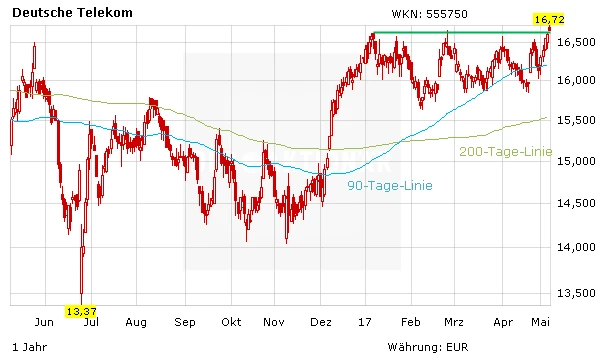 Nach einer erfolgreichen ersten Maiwoche markiert die Aktie der Deutschen Telekom im heutigen Handel ein neues Jahreshoch bei 16,77 Euro. Damit gelingt der Ausbruch aus der engen Handelsspanne, in der sich die Aktie seit Jahresbeginn bewegt. Neuer Schwung für eine wichtige Woche.