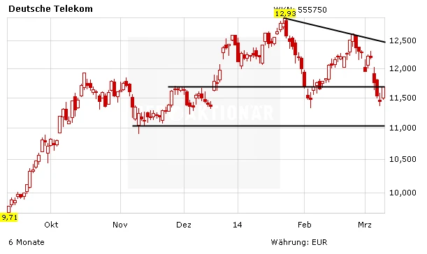 Der Chart der T-Aktie ist angeschlagen. Anleger beachten deswegen in jedem Fall den Stopp bei 11,00 Euro. Gelingt endlich der Verkauf der US-Tochter T-Mobile US, könnte die Aktie schnell wieder in den Fokus der Anleger rücken.
