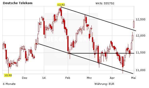 Durch die erneuten Spekulationen über die Tochter T-Mobile US ist der Aktie der Deutschen Telekom der Ausbruch über 12-Euro-Marke gelungen. Investierte Anleger bleiben dabei und sichern ihre Position mit einem Stopp bei 10,40 Euro ab. Das Kursziel lautet nach wie vor 14,00 Euro.