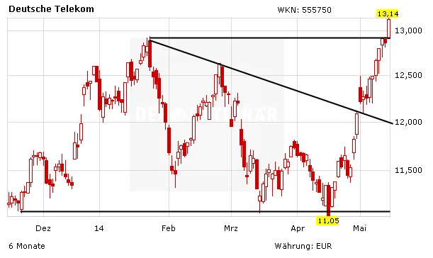 DER AKTIONÄR bleibt zuversichtlich für die Aktie der Deutschen Telekom. Das Unternehmen zeigt mit seinen starken Zahlen eine solide Entwicklung. Die Spekulationen über den Verkauf der Tochter T-Mobile US sorgten bei der Aktie wieder für neuen Rückenwind. Dem Wert zuletzt der Ausbruch über die 13-Euro-Marke gelungen. Investierte Anleger bleiben dabei und sichern ihre Position mit einem Stopp bei 10,40 Euro ab.