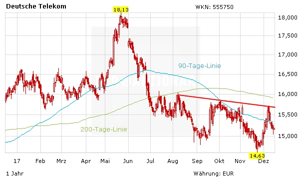 Die T-Aktie macht im Rahmen der Übernahme nur minimale Kursgewinne. Die niederländische Beteiligung ist schlicht zu klein, um den Aktienkurs der Konzernmutter deutlich zu bewegen. Dennoch könnten die positiven News dem Papier helfen den mittelfristigen Abwärtstrend zu verlassen, der seit Scheitern der Übernahme von T-Mobile US anhält. Erste Marke nach oben ist das Hoch vom 12.August bei 15,73 Euro. Die nächste Hürde in Form der 200-Tage-Linie liegt aktuell bei 15,90 Euro.