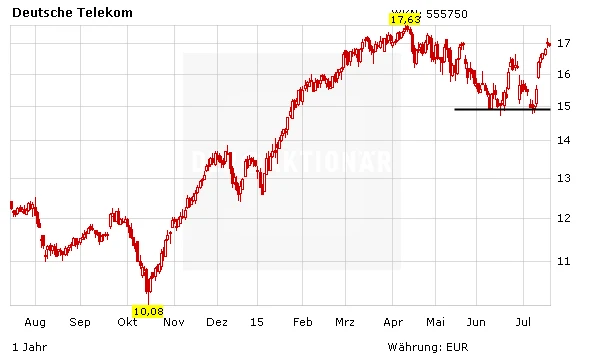 Die T-Aktie hatte sich zuletzt wieder auf den Weg zu ihrem 52-Wochen-Hoch bei 17,63 Euro gemacht. Die Meldung über das mögliche Aus bei den Übernahmeverhandlungen hat die Stimmung unter den Aktionären am Freitag aber etwas getrübt – im Bereich der 17-Euro-Marke war vorerst Schluss. Die charttechnische Situation bleibt aber aussichtsreich.