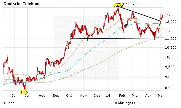 Die Aktie der Deutschen Telekom hat zuletzt ordentlich Boden gut gemacht. Von rund elf Euro ging es bei auf 12,50 Euro nach oben. Dadurch wurde der Abwärtstrend nach oben verlassen. Unter anderem haben Spekulationen um ein Gebot für die Tochter T-Mobile US das Interesse der Marktteilnehmer für die Telekom-Aktie angeheizt. Investierte Anleger bleiben dabei und sichern ihre Position mit einem Stopp bei 10,40 Euro ab.