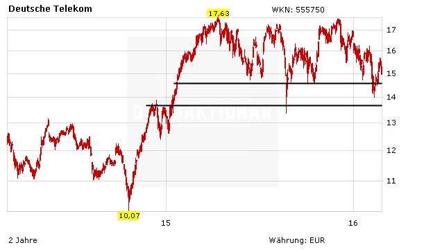 Schon im Vorfeld dieses Termins stellt der DAX-Konzern Investoren eine Mindestdividende von 50 Cent je Aktie unter Vorbehalt der Zustimmung der Hauptversammlung am 25. Mai in Aussicht. Auch soll voraussichtlich ein Umtausch in neue Aktien möglich sein. Die von der Nachrichtenagentur Bloomberg befragten Analysten rechnen mit einer Ausschüttung von 53 Cent je Aktie. Bei einem erwarteten Gewinn von 76 Cent je Aktie würde die Ausschüttungsquote dann bei rund 70 Prozent liegen. Im Vorjahr hatten die Bonner nur einen Gewinn von 54 Cent je Aktie erzielt und trotzdem eine Dividende von 50 Cent je Aktie an die Anteilseigner gezahlt. Wächst der für die Dividende maßgebliche Free Cash Flow, soll die Dividende für die Geschäftsjahre 2016 bis 2018 steigen. Auch die US-Tochter T-Mobile US entwickelt sich gut. Mit den kürzlich vorgelegten Jahreszahlen hat die US-Tochter die Erwartungen von Analyst Peter Nielsen vom Analysehaus Kepler Cheuvreux leicht übertroffen. Die starke Entwicklung und der im Rahmen der Markterwartungen ausgefallene Ausblick auf 2016 stützten auch seine Prognosen für den Mutterkonzern. Die Einstufung für die T-Aktie hat Nielsen auf „Buy“ mit einem Kursziel von 18 Euro belassen.