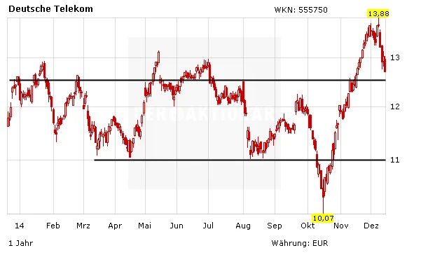 Aus charttechnischer Sicht hat die Aktie zuletzt eine Konsolidierung eingeschlagen. Aktuell notiert der Wert auf Höhe der Unterstützung bei 12,50 Euro. Mit den positiven Nachrichten könnte die Deutsche Telekom aber wieder nach oben drehen und in Richtung des Jahreshochs bei 13,88 Euro laufen. Sollte diese Unterstützung allerdings nicht halten droht ein Abverkauf bis in den Bereich von 11 Euro.
