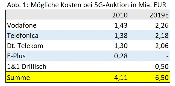 Anders sieht es dagegen bei Telefonica Deutschland und Drillisch aus. Telefonica Deutschland erzielt gerade einmal einen Bruchteil der oben geschätzten Kosten als Jahresüberschuss, allerdings kann man hier auch mit starker Unterstützung des Mutterkonzerns Telefonica Europe rechnen. Für Drillisch wären die geschätzten 0,5 Milliarden eine größere Belastung. Diese entsprechen alleine zehn Prozent der Marktkapitalisierung. Allerdings könnte auch das durch ein einmliges Aussetzern der Dividende finanziert werden.