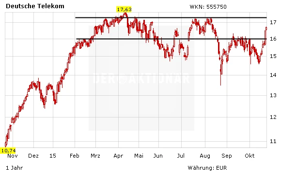 Im Zuge der DAX-Rallye am Donnerstag hat die T-Aktie bereits den Widerstand im Bereich der 16-Euro-Marke geknackt. Am Freitag geht es für das Papier weiter bergauf. Die nächste charttechnische Hürde wartet nun bei 17,40 Euro, wo die obere Begrenzung des aktuellen Seitwärtstrends verläuft. Investierte Anleger lassen die Gewinne laufen.