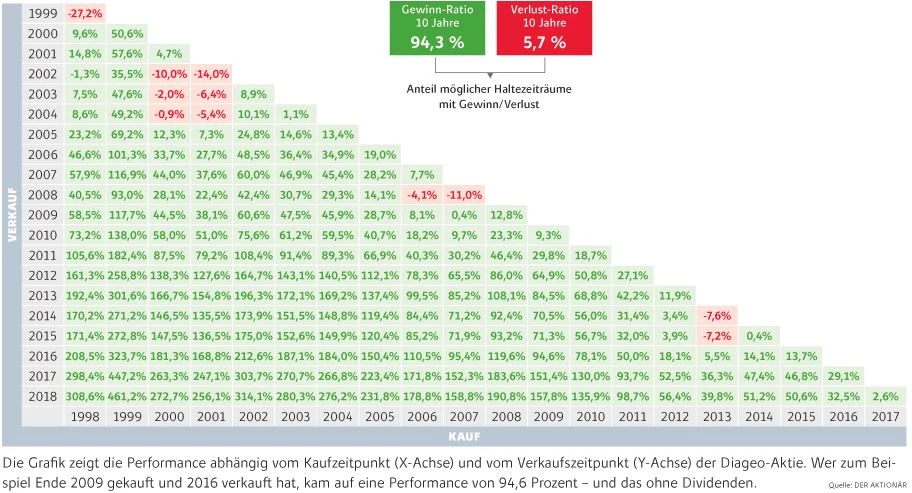 Getrunken wird immer, lautet eine flapsige Börsenweisheit. Dass sie wahr ist, zeigt sich an der langfristigen Performance von Diageo. Bei der Gewinnmatrix des AKTIONÄR kommt die Aktie des britischen Schnaps- und Bierherstellers auf den beeindruckenden Wert von 94,3 Prozent in den vergangenen 20 Jahren.