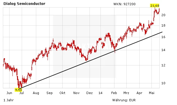 Im ersten Quartal steigerte Dialog Semiconductor den Umsatz auf 221 Millionen Dollar (158,9 Millionen Euro) und damit auf Jahressicht um rund ein Viertel. Der Überschuss stieg dank steigender Gewinnspannen um 43 Prozent auf 14,1 Millionen Dollar. Grund genug für etliche Analysten ihre Kursziele nach oben zu schrauben. Hauck & Aufhäuser sieht den fairen Wert für den Titel mittlerweile bei 26,50 statt bei 25,00 Euro und das Analysehaus Jefferies erhöhte das Kursziel von 19,35 auf 25,00 Euro.