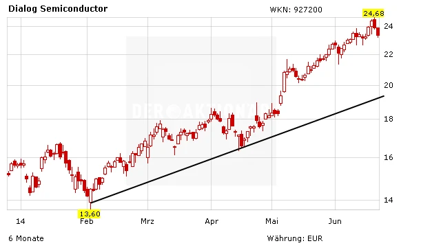 Berichten zufolge könnte die Computer-Armbanduhr iWatch im Oktober auf den Markt kommen. Davon dürfte auch der Apple-Zulieferer Dialog Semiconductor profitieren. Aufgrund der zu erwartenden Verkaufszahlen der iWatch sind auch die Experten des Bankhaus Lampe zuversichtlich für die Papiere von Dialog Semiconductor. Analyst Karsten Iltgen bestätigte in seiner jüngsten Studie die Kaufempfehlung und erhöhte das Kursziel von 21 auf 26 Euro. Im ersten Quartal steigerte Dialog Semiconductor den Umsatz auf 221 Millionen Dollar (158,9 Millionen Euro) und damit im Vergleich zum Vorjahreszeitraum um rund ein Viertel. Der Überschuss stieg dank steigender Gewinnspannen um 43 Prozent auf 14,1 Millionen Dollar.