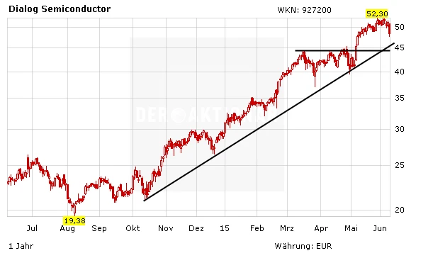 Die Aktien des TecDAX-Favoriten Dialog Semiconductor sind am Dienstag im schwachen Marktumfeld erheblich unter Druck geraten: Zeitweise verlor das Papier sechs Prozent. Am Nachmittag steht noch ein Minus von 4,2 Prozent auf 48,90 Euro zu Buche. Damit ist Dialog hinter Evotec der zweitschwächste Wert im deutschen Technologiewerte-Index. Bis zuletzt hatten sich die Papiere des Apple-Partners enorm widerstandsfähgig gegen die Korrektur am Aktienmarkt gezeigt. Mit fast 65 Prozent Plus blieben sie auch jetzt noch bester Wert im Technologie-Index für 2015. Auch im 12-Monats-Vergleich führt die Aktie die Gewinnerliste mit einem Plus von 113 Prozent deutlich an.