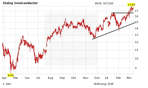 Eine Fortsetzung des Aufwärtstrends wäre auch fundamental gerechtfertigt. Das Geschäft bei dem Chiphersteller brummt. Für das laufende Jahr rechnet der Konzern zum achten Mal in Folge mit einem wachsenden Umsatz. Dialog Semiconductor profitiert unter anderem von dem Trend hin zu mehr mobilen Endgeräten wie Smartphones und Tablets. Mit ihren Lösungen für das Powermanagement bei Prozessoren spielt Dialog Semiconductor bereits seit geraumer Zeit in der ersten Liga mit. Die von der Nachrichtenagentur Bloomberg befragten Analysten sind für den Chiphersteller durch die Bank optimistisch. Von insgesamt 21 Experten empfehlen 14 den Titel zum Kauf vier votieren zum Halten und nur drei sprechen sich für einen Verkauf aus.