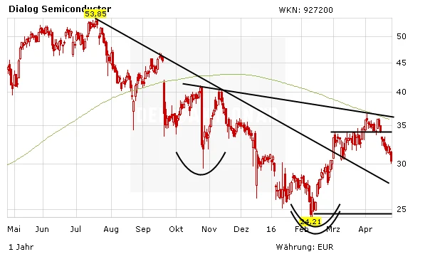 Die Aktie des Chip-Entwicklers und Apple-Zulieferers Dialog Semiconductor schwächelt im Vorfeld der Zahlen des größten Kunden Apple. Analysten sind skeptisch, was die Entwicklung im zurückliegenden Quartal betrifft. Von Januar bis März erwarten sie 52 Milliarden Dollar Umsatz und ein Ergebnis je Aktie von rund zwei Dollar. Das würde heißen, dass Apple erstmals seit 2003 ein Umsatzminus eingefahren hätte.