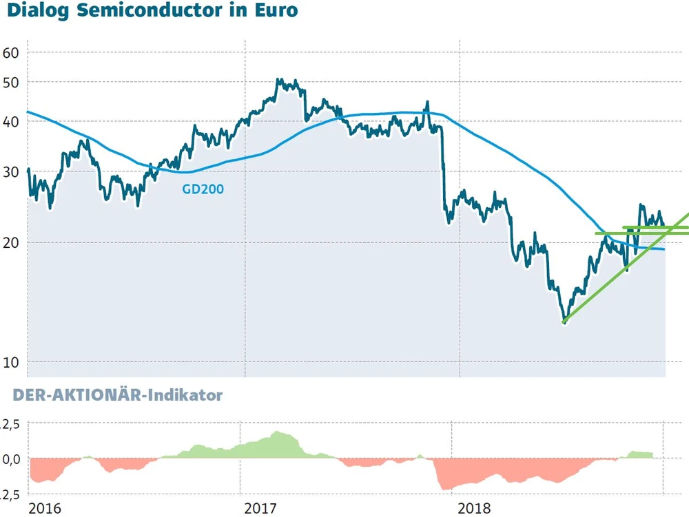 Trotz der Absatzsorgen beim iPhone befindet sich Dialog Semiconductor in einem kurzfristigen Aufwärtstrend. Das in Ausgabe 43/2018 platzierte Kauflimit für die Aktie bei 19,50 Euro wurde erreicht, damit gilt für laufende Positionen ein Stopp bei 16,50 Euro.