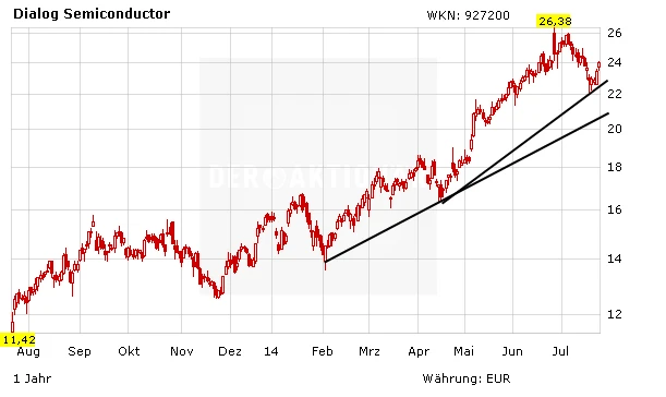 Für Zuversicht sorgt auch der Blick nach vorne. Apple hat laut einem Zeitungsbericht die Produktion von 70 bis 80 Millionen Geräten seines nächsten iPhone-Modells in Auftrag gegeben. Das wäre der bisher größte Produktionsauftrag zu einem iPhone-Start. Zuletzt waren im Herbst 2013 das iPhone 5s und das iPhone 5c im ersten Anlauf 50 bis 60 Millionen Geräte produziert worden. Zuletzt sorgte Dialog Semiconductor am Dienstag für Schlagzeilen, als bekannt gegeben wurde, dass dass die Fusionsgespräche mit AMS gescheitert sind. Man konnte sich auf keine gemeinsame Linie einigen. AMS hätte bis zum 24. Juli ein konkretes Übernahmeangebot an die Aktionäre von Dialog machen müssen.