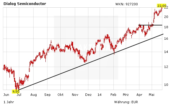 Die Quartalszahlen von Dialog Semiconductor fielen hervorragend aus. Im ersten Quartal steigerte Dialog Semiconductor den Umsatz auf 221 Millionen Dollar (158,9 Millionen Euro) und damit auf Jahressicht um rund ein Viertel. Der Überschuss stieg dank steigender Gewinnspannen um 43 Prozent auf 14,1 Millionen Dollar. Dementsprechend optimistisch sind auch die Analysten. Von insgesamt 21 befragten Analysten durch die Nachrichtenagentur Bloomberg empfehlen 14 die Aktie zu kaufen, fünf sprechen eine Halteempfehlung aus und nur zwei votieren zum Verkauf. Mit einem Kursziel von 30,00 Euro sind die Profis von RBC Capital Markets am optimistischsten.