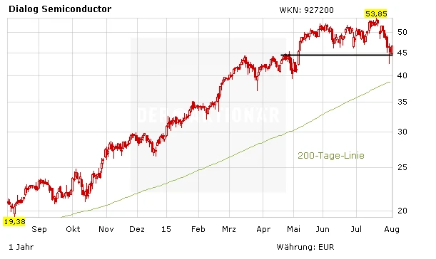 So hat Peter Olofsen vom Analysehaus Kepler Cheuvreux die Einstufung für Dialog Semiconductor auf "Buy" mit einem Kursziel von 58 Euro belassen. Die Rahmenbedingungen für die Halbleiterbranche hätten sich zuletzt verschlechtert, schrieb Olofsen in einer Branchenstudie vom Montag. Er bevorzuge weiterhin Qualitätswerte mit gut zu prognostizierender Geschäftsentwicklung. Dazu zählten ARM Holdings, ASML und Dialog Semiconductor. Die Dialog-Aktie zählt der Experte zu den attraktivsten im Sektor.
