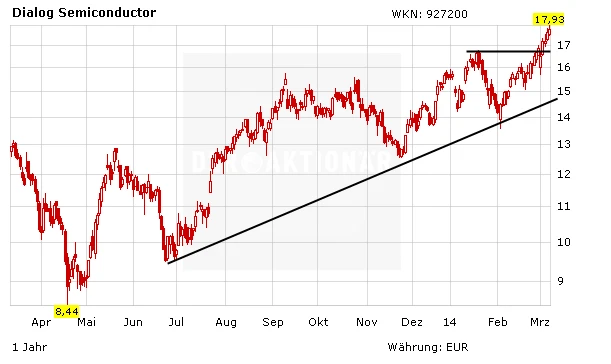 Die Papiere des Chipherstellers Dialog Semiconductor haben zuletzt eine beeindruckende Rallye aufs Parkett gelegt. Für Unterstützung sorgten die guten Jahreszahlen und auch die Mobilfunkmesse MWC in Barcelona, auf der Trend hin zu mehr mobilen Endgeräten deutlich wurde, beflügelte die Aktie.
