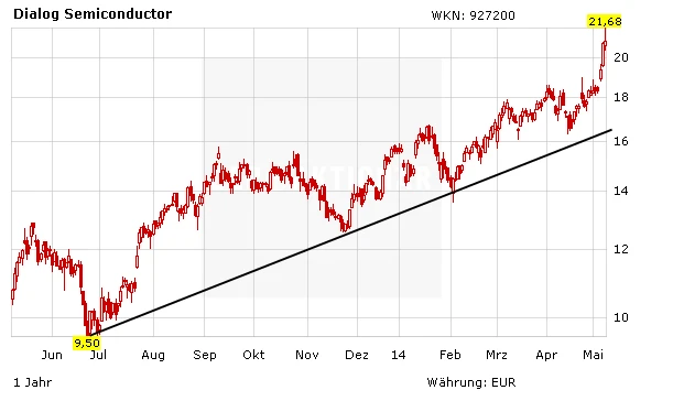 Hauck & Aufhäuser-Analyst Tim Wunderlich bestätigte nach den Zahlen das „Buy“-Rating für Dialog Semiconductor. Das Kursziel erhöhte er von 25,00 auf 26,50 Euro. Daraus resultiert eine Kurschance von rund 30 Prozent. Die Diversifizierung des Halbleiterkonzerns zahle sich seiner Meinung nach aus. Die Fokussierung auf den Hauptkunden Apple dürfte im vierten Quartal mit 80 Prozent den Höchstwert erreicht haben.