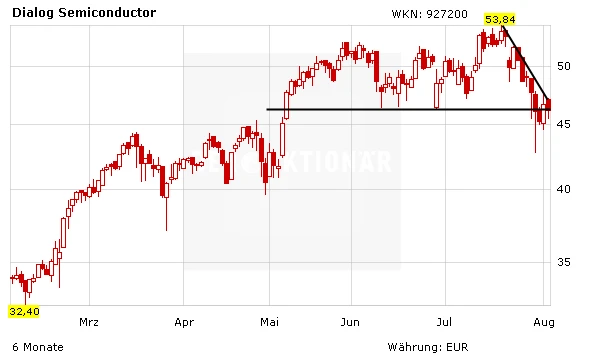 Die letzte Woche kostete den Anlegern von Dialog Semiconductor so manchen Nerv. In Folge der Zahlen zum zweiten Quartal ist die Aktie bis auf 42,67 Euro abgerutscht. Nachdem sich der Aktienkurs am Montag etwas erholte, ging es am Tag darauf wieder abwärts. Der Dialog Semiconductor-Titel steht aktuell erneut im Minus und damit am Ende der TecDAX-Verlierer.