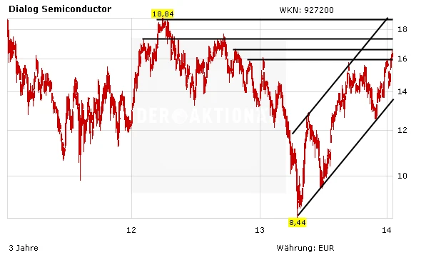 Hinzu kommt ein starker globaler Tablet-Absatz. Das Marktforschungsinstitut Gartner geht von 47 Prozent Absatzplus auf 263 Millionen Geräte aus. Auch davon dürfte Dialog profitieren, das man sowohl Branchenprimus Apple, als auch Intel für dessen Bay-Trail-Prozessoren beliefert. Ziel von Intel ist es, 2014 mindestens 40 Millionen Tablets mit Prozessoren zu bestücken.