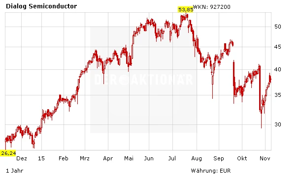 Das Düsseldorfer Bankhaus Lampe hat die Einstufung für Dialog Semiconductor auf "Kaufen" mit einem Kursziel von 50 Euro belassen. Das iPad Pro des US-Herstellers Apple soll am 11. November auf den Markt kommen und dürfte als erstes Produkt zwei Chips von Dialog enthalten, erläuterte Analyst Karsten Iltgen in einer Studie. Die Abstimmung zur Übernahme von Atmel am 19. November könnte die Aktien auch noch einmal bewegen.