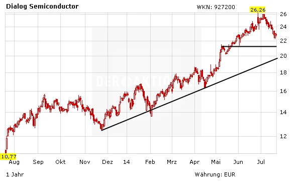 Die Absage der möglichen Übernahme dürfte heute schwerer wiegen als die positiven Meldungen hinsichtlich des Produktionsstarts des neuen iPhones, das für Dialog wichtig ist und vor allem im zweiten Halbjahr eine starke operative Entwicklung erwarten lässt. Dialog-Aktionäre müssen sich daher heute eher auf fallende Notierungen einstellen. Das ändert nichts an den mittel- bis langfristig positiven Aussichten. Unter Umständen bekommen potenzielle Neueinsteiger noch einmal eine günstige Einstiegsgelegenheit.