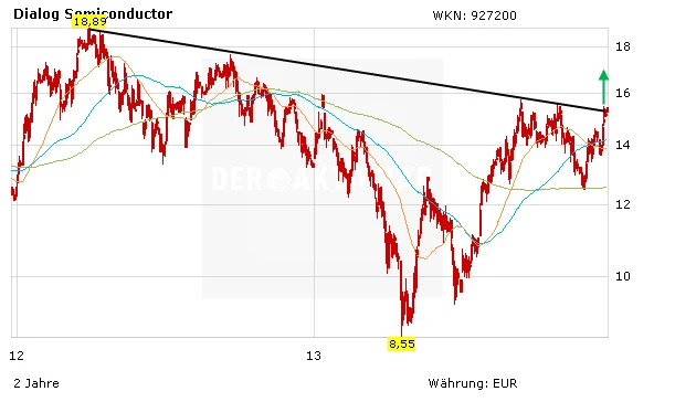 Wie geht es weiter? Die fundamentalen Aussichten bei Dialog Semiconductor sind weiter hervorragend. Das Gros der Analysten sieht deutliches Kurspotenzial. Mit dem nachhaltigen Sprung über den Abwärtstrend bei 15,25 Euro, wäre der Weg bis in den Bereich um 17,80 Euro beziehungsweise 19 Euro geebnet. DER AKTIONÄR spekuliert im Real-Depot weiter mit einem Wave-Call von der Deutschen Bank auf dieses Szenario. Die Position liegt aktuell über 44 Prozent im Plus.