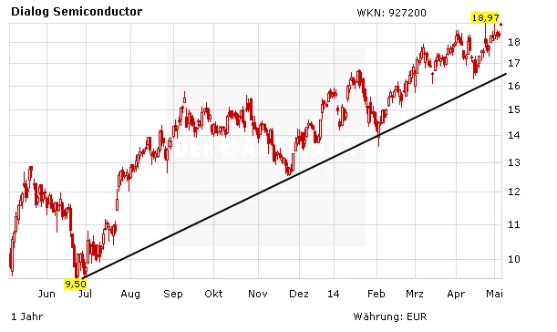 Dialog Semiconductor profitiert vom Trend hin zu mobilen Endgeräten. Erst kürzlich hatte der iPhone-Hersteller Apple für das üblicherweise eher ruhige Vierteljahr nach Weihnachten mit einem unerwartet hohen iPhone-Absatz überrascht. Investierte Anleger bleiben dabei. Auch für einen Neueinstieg ist es noch nicht zu spät. Über der 19-Euro-Marke wurde ein massives Kaufsignal ausgelöst.
