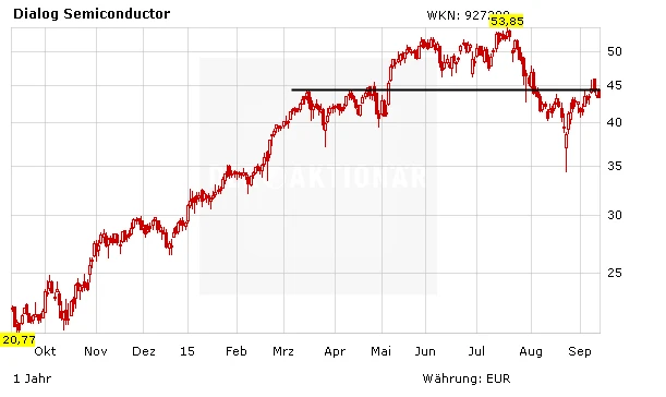 Das Papier hatte sich von seinem Zwischentief im August unter 35 Euro kräftig erholt. Am Mittwoch kostete es vor der Produktpräsentation von Apple noch bis zu 45,825 Euro. Damit hatte sich die Aktie in zweieinhalb Wochen um bis zu 33 Prozent erholt. Dialog wird als Zulieferer des iPhonebauers am Markt wahrgenommen.