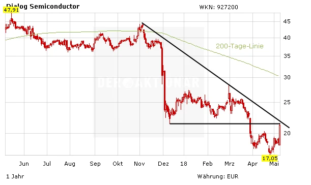 Mit dem heutigen Kursspung hat die Dialog-Aktie einen ersten Schritt aus dem Tal der Tränen gemacht. Dennoch befindet sich der TecDAX-Titel unverändert im Abwärtstrend und hängt am horizontalen Widerstand (Januar-Tief) weiter fest. Sowohl charttechnisch als auch fundamental drängt sich aktuell (noch) kein Einstieg beim Chiphersteller auf.