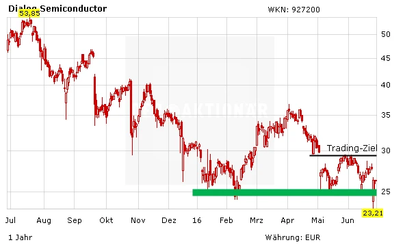 Die Aktie konnte in der Brexit-Panik die Unterstützung bei 25 Euro verteidigen. Das zeigt, dass auf dem aktuellen Niveau Kaufinteresse besteht. Dialog bietet auf dem aktuellen Niveau eine gute Trading-Chance. Allerdings erschwert die hohe Volatilität am Gesamtmarkt die Platzierung eines sinnvollen Stopps. Der muss, um nicht "unglücklich" ausgestoppt zu werden, großzügig gewählt werden.