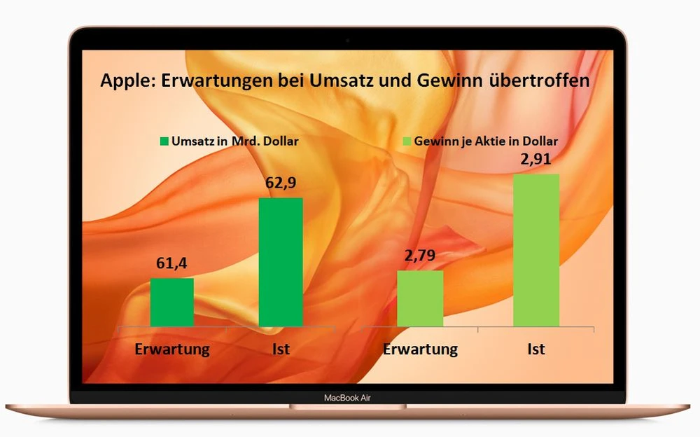 Apple schaffte im vergangenen Quartal einen kräftigen Sprung bei Umsatz und Gewinn und konnte die Analystenerwartungen im Septemberquartal deutlich schlagen: Statt erwarteten 2,79 Dollar verdiente Apple 2,91 Dollar je Aktie. Der Umsatz stieg um ein Fünftel auf 62,9 Milliarden Dollar und damit ebenfalls kräftiger als erwartet (siehe Grafik).