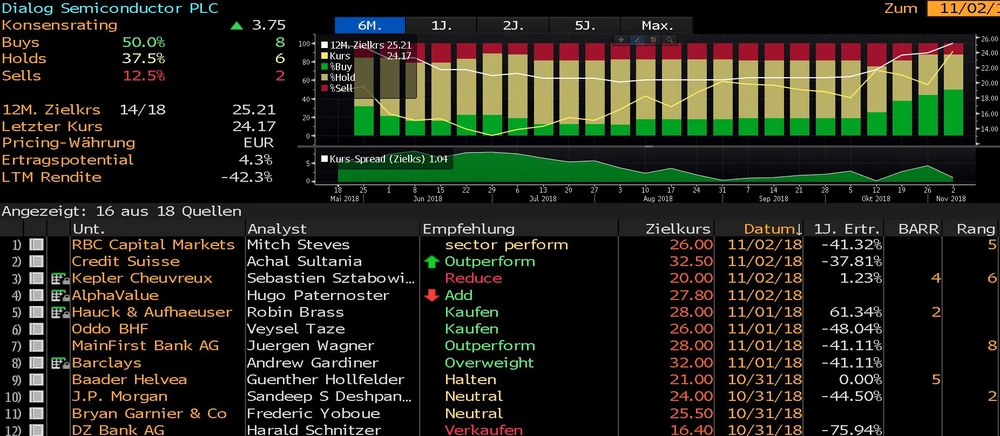 Das Analysehaus RBC hat das Kursziel für Dialog Semiconductor <GB0059822006> nach einem Analystentag von 23 auf 26 Euro angehoben und die Einstufung auf "Sector Perform" belassen. Die aktuellen Informationen zur Finanzsituation des Halbleiterherstellers seien positiv aufgenommen worden, schrieb Analyst Mitch Steves in einer am Freitag vorliegenden Studie. Im Fokus blieben aber mögliche Übernahmeaktivitäten. Solange die Umsätze, die das nachlassende Geschäft mit Schaltkreisen für das Energiemanagement (PMICs) ausgleichen können, nicht gut genug erkennbar seien, bleibe er an der Seitenlinie.