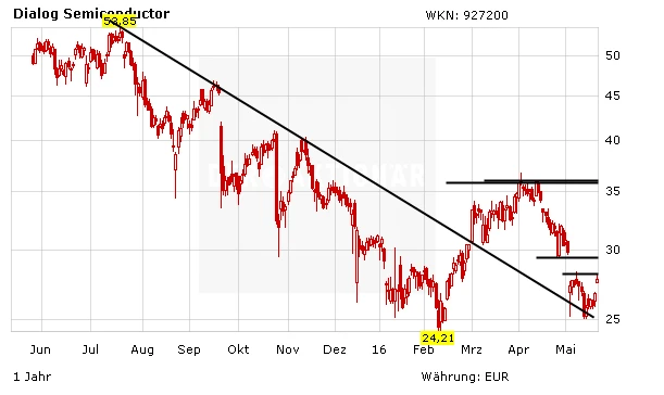 Davon angetrieben werden in Deutschland auch Infineon im DAX mit aktuell +1,9 Prozent und Dialog Semiconductor mit +4 Prozent. Die Trading-Empfehlung bei knapp 25 Euro hat sich somit bereits bezahlt gemacht. Damit sollte die Aktie zumindest das Gap zwischen 28,30 und 29,50 Euro schließen. Die Chance auf eine W-Umkehr ist damit gestiegen, allerdings müsste der Wert dazu das Hoch bei 35,85 Euro herausnehmen.