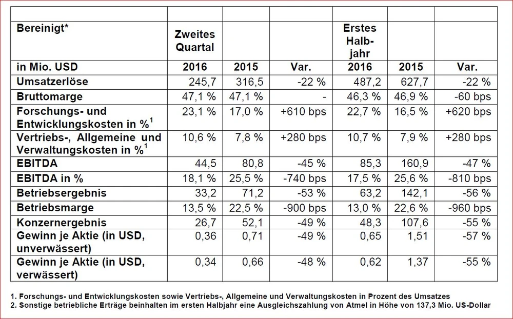 Mit einem Umsatz 245,7 Millionen US-Dollar lag der Chip-Entwickler im Rahmen des eigenen Zielkorridors . Das Betriebsergebniss war gegenüber Q2 2015 um 53 Prozent rückläufig auf 33,2 Millionen Dollar. Die maue Nachfrage im Smartphone-Geschäft macht der TecDAX-Firma zu schaffen. Die Zahlen im Detail: