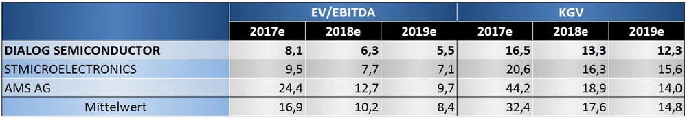 Unter Bewertungsaspekten ist Dialog Semiconductor sogar fast schon wieder ein Schnäppchen: STMicro (einer von 20 Werten im AKTIONÄR Titan 20 Index) und AMS, beides ebenfalls in Europa notierte Apple-Lieferanten kommen auf deutlich höhere Bewertungskennzahlen. Sowohl mit Blick auf das KGV als auch beim Unternehmenswert/EBITDA-Verhältnis ist Dialog günstiger als STMicro und AMS.