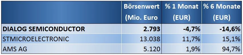 Wie ein Damoklesschwert hängt daher die seit Monaten andauernde Spekulation über der Aktie, dass Dialog bei Apple Liefervolumen ab dem Jahr 2019 einbüßen könnte. Was das betrifft, blieb Bagherli bisher bei seiner entspannten Haltung, angesichts der wachsende Zahl an Powermanagement-Projekten beim größten Kunden. Dennoch: Der Kurs hat sich im Vergleich zu ebenfalls für Apple tätige Wettbewerber deutlich schlechter entwickelt.