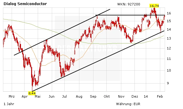 Die Veröffentlichung der Quartalszahlen ist für den 20. Februar angesetzt. Was das vierte Quartal betrifft, sollte das Zahlenwerk im Wesentlichen den vorläufigen Angaben entsprechen. Bei 352 Millionen Dollar dürfte Dialog im vierten Quartal 60 Millionen Dollar EBIT erzielt haben. Für den Kurs entscheiden sind daher die Aussagen für das laufende Jahr und die Guidance für die ersten drei Monate. Diese fallen üblicherweise deutlich schwächer als das starke Weihnachtsquartal aus. Dennoch ist davon auszugehen, dass die TecDAX-Firma gegenüber dem ersten Quartal des Vorjahres ein deutliches Wachstum in Aussicht stellt. Die Commerzbank rechnet mit 235 Millionen Dollar Umsatz, was einem Plus von 31 Prozent gegenüber den ersten drei Monaten 2013 entsprechen würde. Neben den Zahlen wird es unter Umständen auch eine Aussage bezüglich neuer Entwicklungsaufträge beziehungsweise neuer Produkte geben. Durch die Rapid-Charger-Technologie (iWatt) zum Beispiel hat Dialog gute Chancen, die Verkaufspreise und den Umsatz je beliefertes Gerät hochzuschrauben. Erste Spekulationen schießen zudem ins Kraut, dass Dialog auch bei einer iWatch, die für das vierte Quartal 2014 erwartet wird, Chips zuliefern wird.