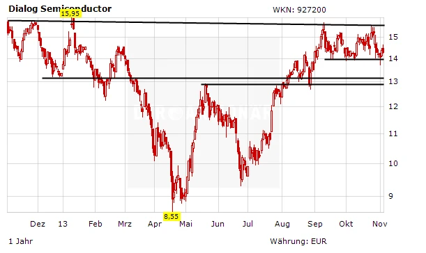 Nach dem starken Wochenauftakt befindet sich die Aktie von Dialog Semiconductor heute im Konsolidierungsmodus. Aus charttechnischer Sicht ist es entscheidend, dass der Titel die 14-Euro-Marke verteidigt. Analysten trauen dem Wert noch einiges zu.