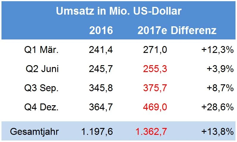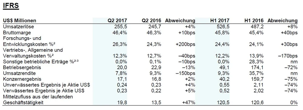 Aus aktueller Sicht erwartet das Management für das dritte Quartal 2017 einen Umsatz im Bereich von 340 bis 370 Millionen Dollar. Mit Blick auf die geschäftliche Dynamik und eine solide Pipeline wichtiger Produkteinführungen in der zweiten Jahreshälfte ist man zuversichtlich, dass 2017 ein Jahr mit gutem Umsatzwachstum wird. Was den Blick auf das zweite Halbjahr betrifft, wurde das Management etwas konservativer, als bisher vom Markt erwartet, was dem Umstand geschuldet sein dürfte, dass bei Schlüsselkunden Apple die Produkteinführung wegen Lieferschwierigkeiten beim Display verzögert sein dürfte.