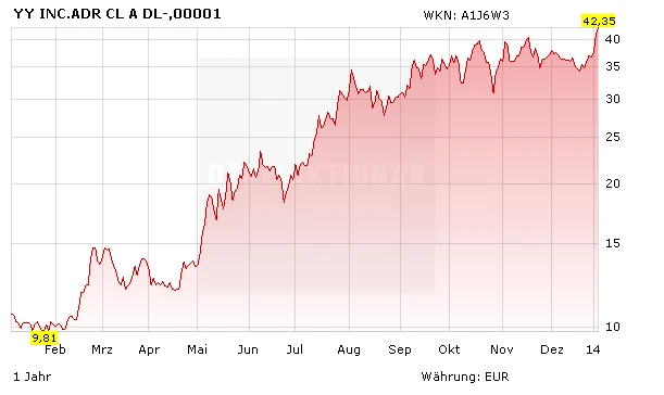 Was für ein Start ins neue Börsenjahr: Um über zehn Prozent schoss die Aktie von YY am vergangenen Freitag nach oben. Seit Jahresbeginn summiert sich die Performance damit auf 15 Prozent. Vieles spricht dafür, dass sich 2014 zu einem weiteren außergewöhnlich gutem Börsenjahr entwickeln wird wie 2013, als sich die Aktie des chinesischen Social Network um 270 Prozent verteuern konnte.