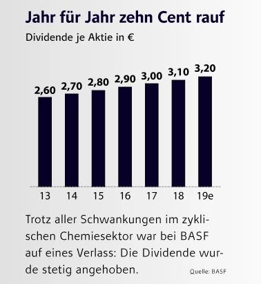 Während Versicherer und Versorger die „üblichen Verdächtigen“ für sichere Dividenden sind, lässt sich dies bei den eher zyklischen Chemiekonzernen nicht behaupten. Doch BASF glänzt seit Jahren mit einer beständigen Dividendenpolitik (siehe Grafik). In Schritten von zuletzt 10 Cent ging es mit der Ausschüttung stetig nach oben. Möglich macht dies zum einen die solide Bilanz, zum anderen aber auch die breite Aufstellung des Chemie-Weltmarktführers in vielen weniger konjunkturabhängigen Bereichen. So ist der DAX-Konzern ein wichtiger Zulieferer für die Nahrungsmittel- und Konsumgüterindustrie. Zudem ist man durch einen Deal mit Bayer zu einem der weltweit wichtigsten Saatguthersteller geworden. Die Chancen, dass es mit der Dividende zukünftig weiter nach oben geht, sind sehr gut.
