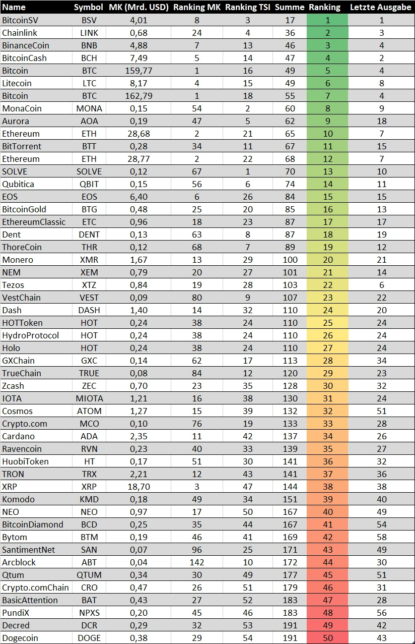 Die folgende Tabelle zeigt nun den Ausschnitt der obersten 50 Coins laut TSI-System. Dies sind also die aktuellen Topfavoriten des Systems, bei denen ein zweiter Blick lohnenswert erscheint. In der TSI-Reportserie sowie im Bitcoin Report wird diese Liste regelmäßig aktualisiert.