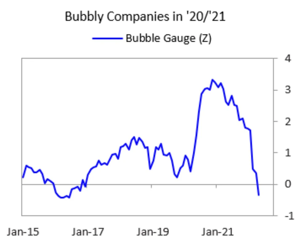 Jetzt, nach den teils starken Kursverlusten, gibt die Fonds-Legende ein weiteres Update. Ja, die Blase sei geplatzt und damit seien wieder normale Niveaus in vielen Bereich erreicht – siehe Grafik. Aber: Das durchschnittliche KGV ist trotz Rückgang immer noch relativ hoch.