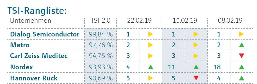 Den genauen Ampelstand finden Anleger in den wöchentlich erscheinenden Ausgaben des AKTIONÄRS. Potenzielle Kaufkandidaten können sich schon im Vorfeld abzeichnen. In der jeweils freitags veröffentlichten TSI-Liste finden sich die aktuell trendstärksten Aktien des HDAX. Dabei gibt es in dieser Woche keine Veränderungen unter den Top 3. Unangefochten auf der Poleposition mit einem TSI-Wert von 99,84 befindet sich die Aktie des Apple-Zulieferers Dialog Semiconductor, dicht gefolgt von Metro und Carl Zeiss Meditec. In der Liste nach oben geschossen ist die Aktie von Nordex, sie verdrängt Hannover Rück vom vierten Rang. Insgesamt befinden sich aktuell fünf Aktien auf einem TSI-Wert von über 90 Prozent und sind damit bereit für eine mögliche Depotaufnahme, sollte die TSI-Ampel auf Grün springen.