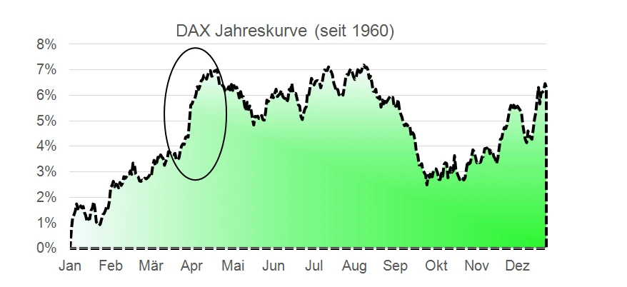 Die Grafik zeigt an, wie sich der DAX durchschnittlich im Jahresverlauf entwickelt. Die vorösterliche Zeit bringt einen signifikanten Renditesprung mit sich. Und die Grafik ist dabei noch etwas verzerrt: Eine bestimmte Zeit rund um Ostern (das Fest fällt in jedem Jahr auf einen anderen Termin) weist sehr gute Gewinnquoten auf. Die Experten von Der Aktionär haben genau nachgerechnet: In der ultimativen Osterstrategie wird gezeigt, wie man hiervon am besten profitieren kann.