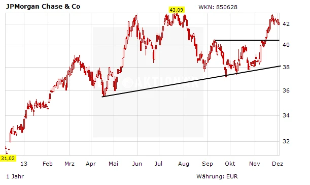 Beide Titel haben Fahrt aufgenommen. Während die Goldman-Sachs-Aktie nach einem Zwischenspurt gerade um die Überwindung der 170-Dollar-Marke kämpft, ist JPMorgan zumindest auf Dollar-Basis kurzfristig der Sprung auf ein neues Jahreshoch gelungen. Noch ist der Ausbruch über das August-Hoch jedoch nicht nachhaltig. Da das laufende KGV von JPMorgan mit 9 niedriger (Goldman Sachs 11) sowie die Dividendenrendite mit 2,3 Prozent höher ist, favorisiert DER AKTIONÄR derzeit JPMorgan.