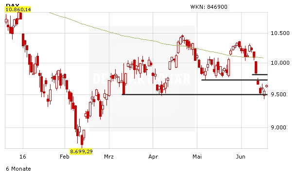 Technisch betrachtet hätte der deutsche Leitindex ein Erholungspotenzial zunächst bis 9.737 Punkte (Mai-Tief). Im Anschluss könnte auch noch das Gap von Anfang Juni bei 9.819 Punkten geschlossen werden. Das 50%-Fibonacci-Retracement der jüngsten Abwärtsbewegung wartet bei 9.872 Zählern.